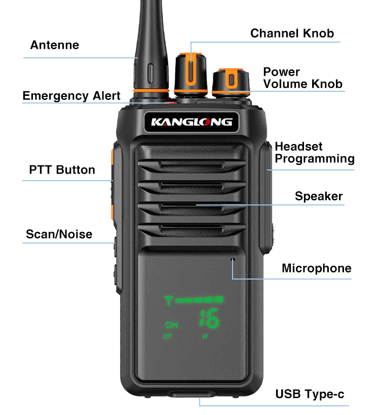 La KANGLONG P500 es una radio analógica de 5 W de alto rendimiento con certificación IP68 de resistencia al polvo y al agua. Diseñada para entornos exigentes, garantiza una comunicación fiable para aplicaciones de seguridad, construcción y marítimas.